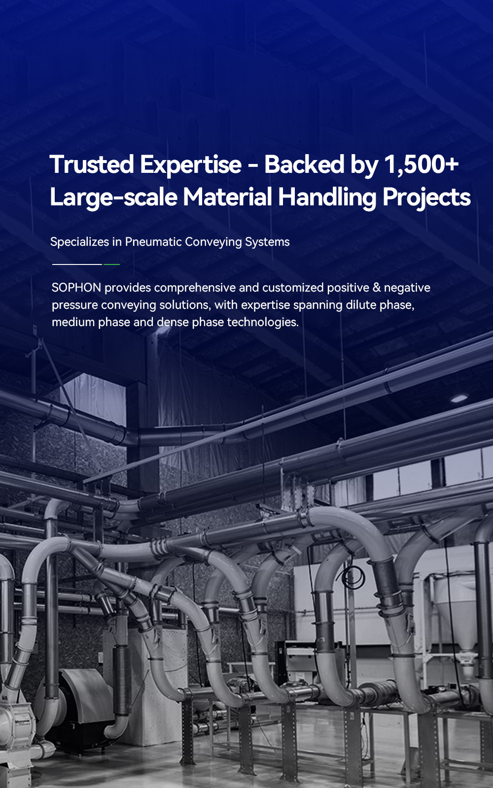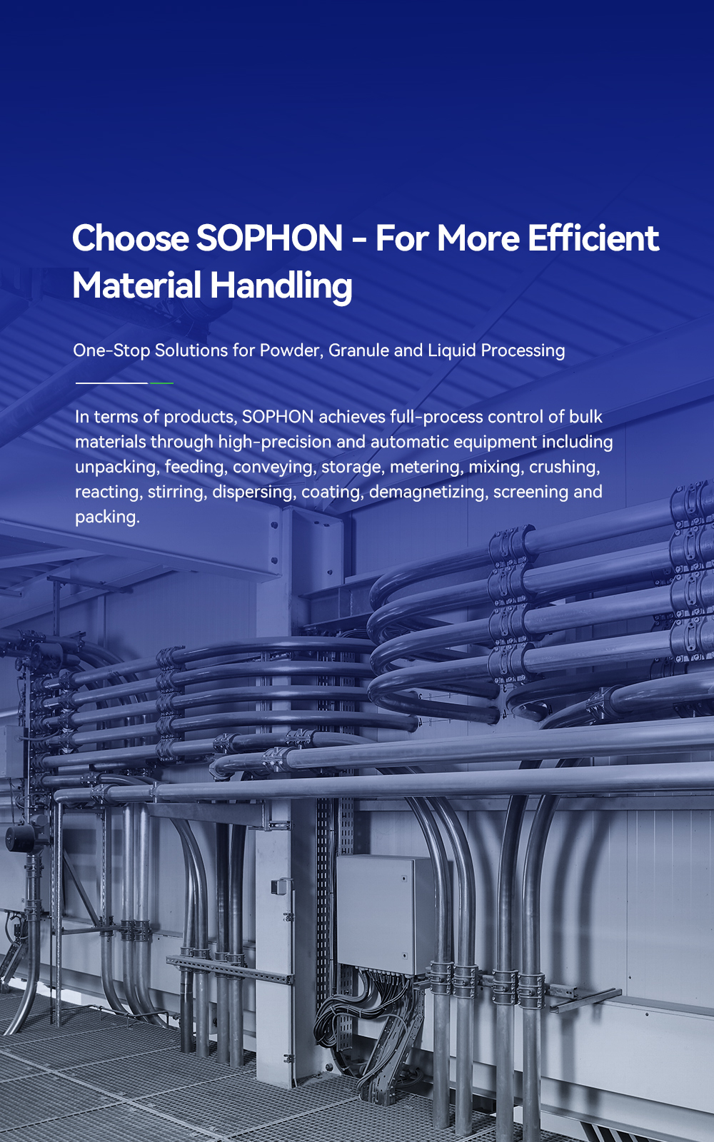 Committed to becoming a world-leading service provider of material handling technologies and upholding forward R&D philosophy in materials and processes, SOPHON provides integrated solutions for the process industry and covers service systems such as advanced design, advanced manufacturing, and advanced operation and maintenance management. Our solutions are widely applied in industries including new energy, new materials, chemical plastics, food, pharmaceuticals, semiconductors, petroleum and petrochemicals.